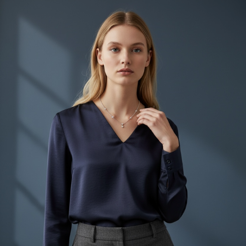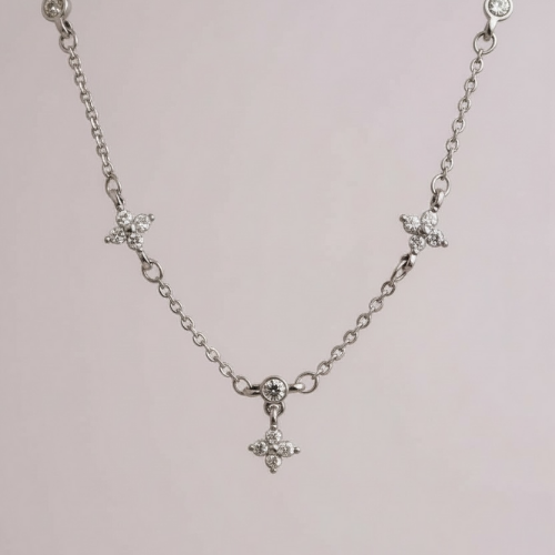上質なシルバーの輝きをまとった小さな星モチーフをバランス良く散りばめ、首元を上品に彩る一本です。