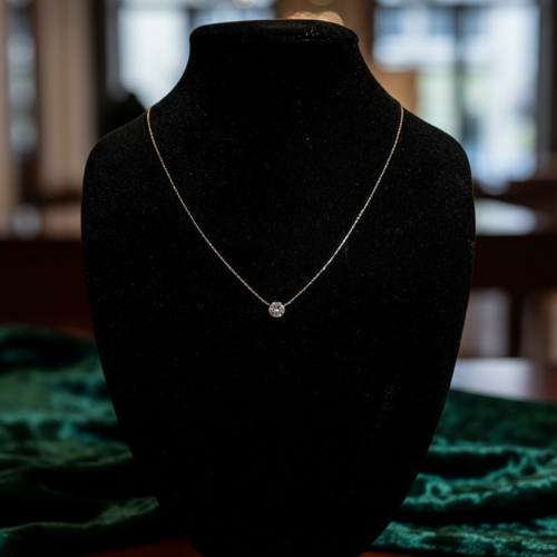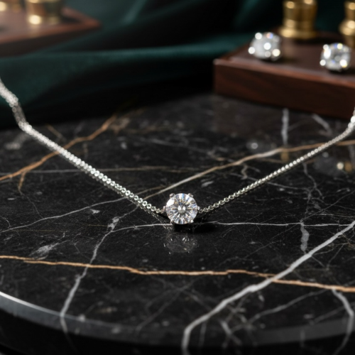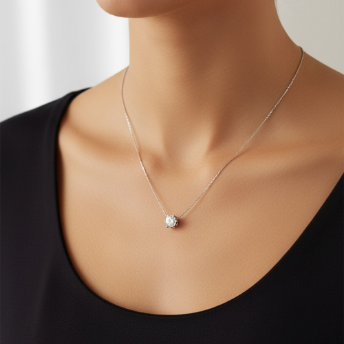 透明度の高いラウンドカットストーンをセンターにあしらい、余計な装飾を省いたミニマルなデザインが特徴です。光を受けるたびに繊細に瞬き、首元に上質な存在感を与えます。